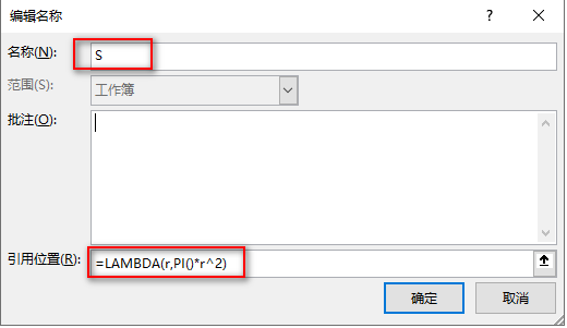 根据圆的半径求面积,用 LAMBD 函数在 Excel 中写公式就是这个样子的: