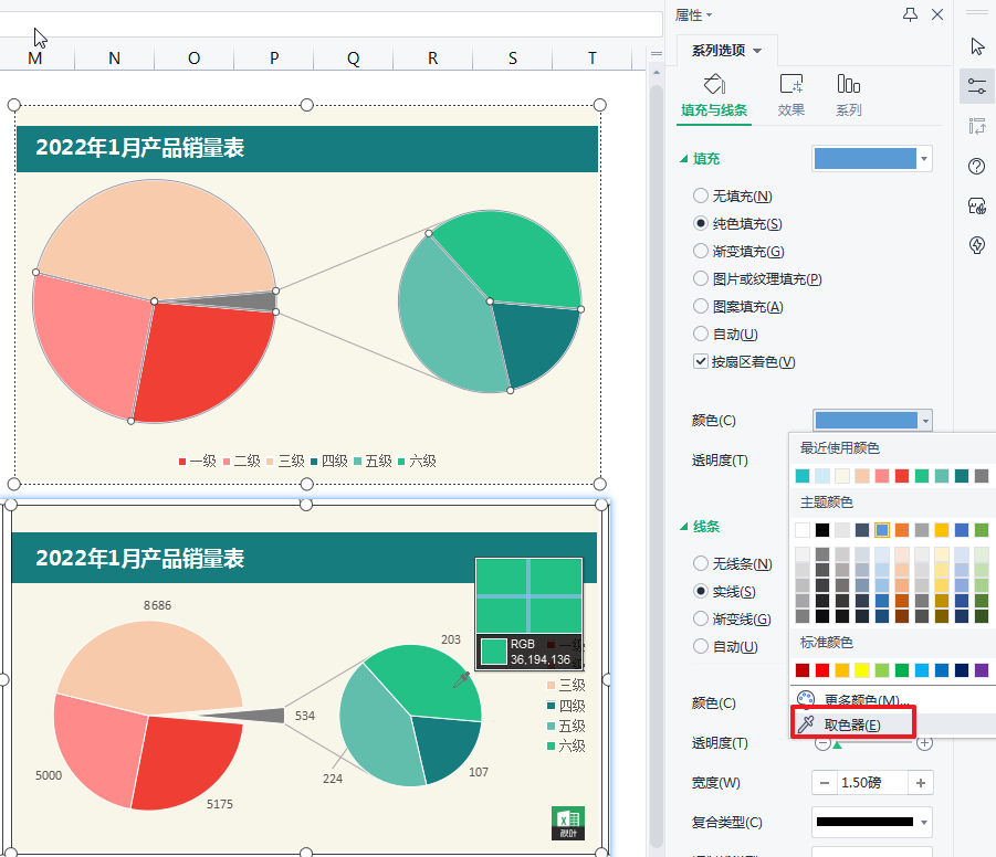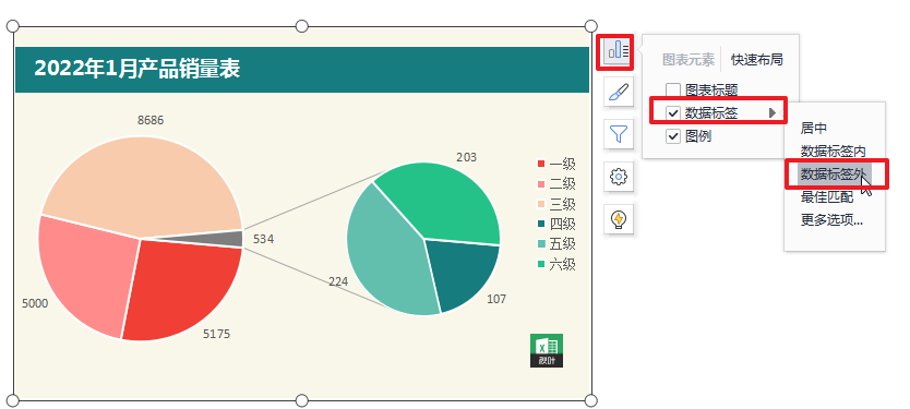 而在饼图中,我们可以使用复合饼图,也称为子母饼图,来进行处理。(子饼图相当于另外设立了次坐标轴。)