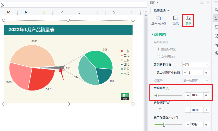 ❻ 选中其他系列(灰色那个扇形),设置属性,将点爆炸型的值设置为 38%(值越大离其他扇形的位移越大)。
