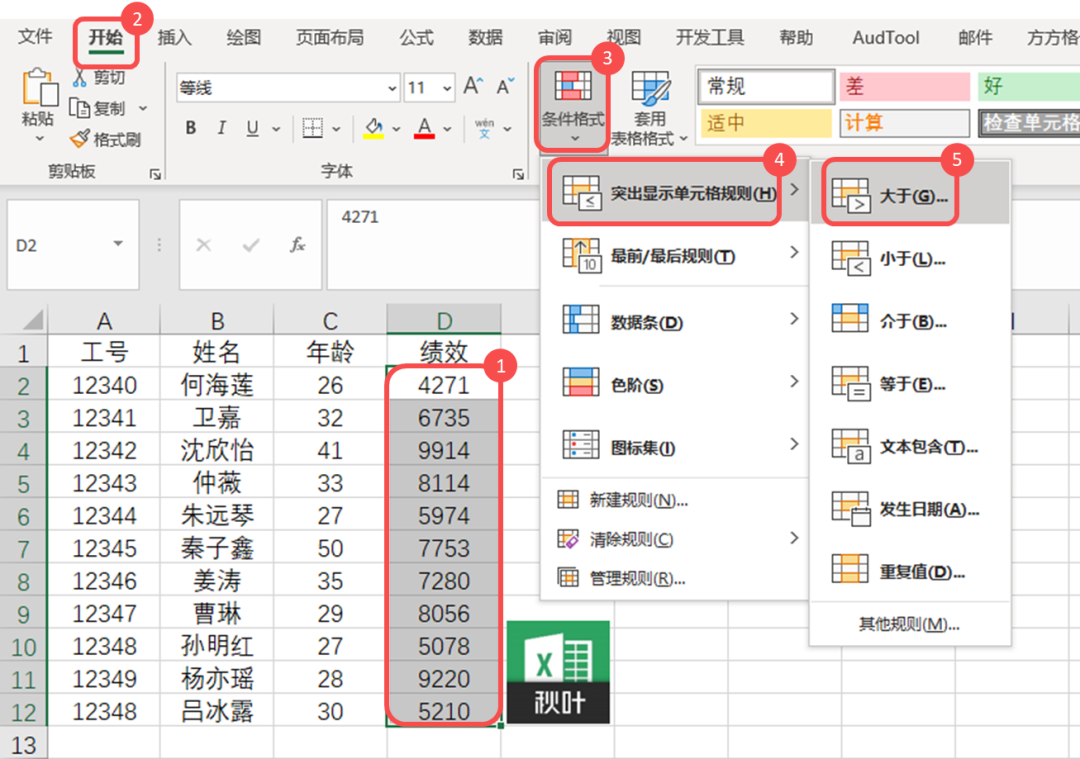 ❷ 在「开始」选项卡中单击「条件格式」-「突出显示单元格规则」-「大于」。