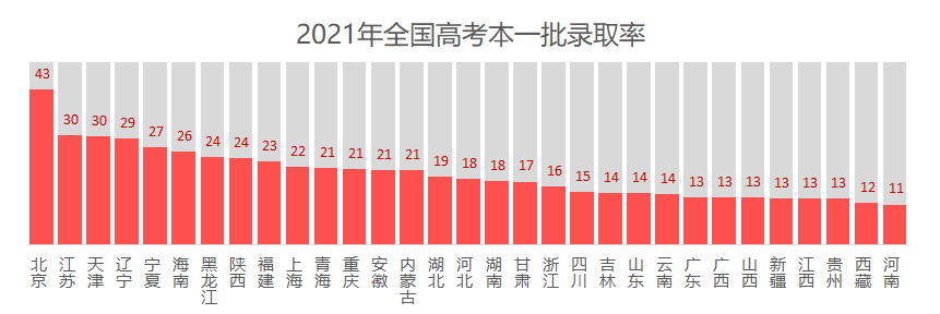 全国一本率最高的省份为北京,为 43%,基本每 5 个本科生中就有 2 个一本学生,着实令人钦羡不已!