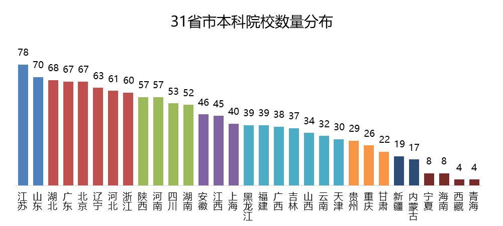 江苏本科院校数量高居全国之首,多少有些出乎意料。同样的,仅有 25 万考生的辽宁也拥有超过 60 所本科院校,这两个省份本科率和一本率较高的原因,或许正在于此。