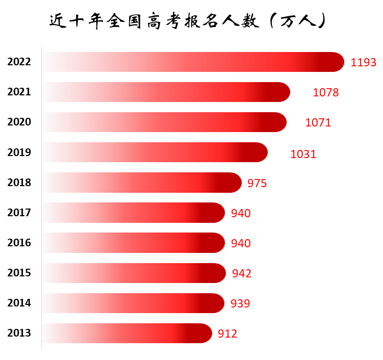 今年,全国共有 1193 万高考考生,比去年增加了 115 万,增长率达到惊人的 10.67%,再次刷新了全国高考报名总人数的记录。