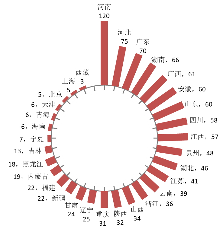 首先从 2022 年的考生规模来看,河南仍旧一枝独秀,报考人数突破 120 万,领先第二名近 50 万,总人数相当于另一人口大省四川的 2 倍有余,甚至比考生人数最少的 11 个省份之和还要多出 10 万人,从这一角度,河南高考之难,无一省份可望其项背。