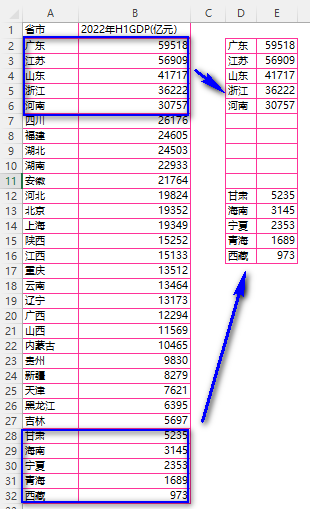 即前 5 行复制前五个省份的数据,中间留 5 个空行,后面 5 行是后五名的省份数据。