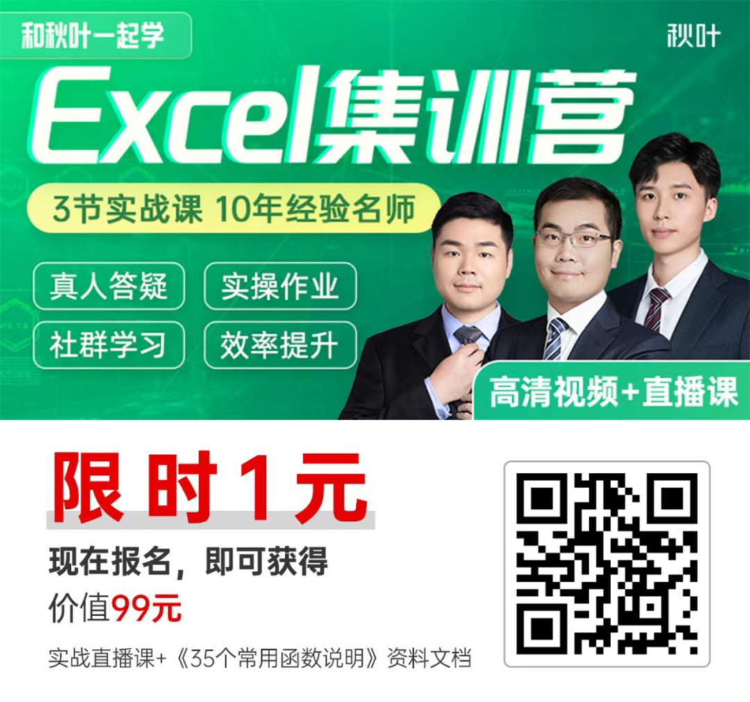 Excel 是提升效率的利器,如果你工作中经常需要和它打交道,小 E 推荐你学习《秋叶 Excel 3 天集训营》!助你全面、快速提升 Excel 技能,消灭工作中常见的效率黑洞!
