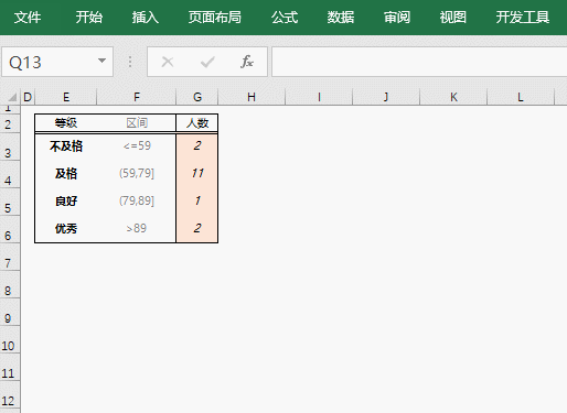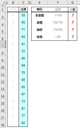 有一定基础的同学,第一反应可能是用 COUNTIF 函数。 使用 COUNTIF 函数,我们需要在 G 列输入以下公式:❶ G3 单元格输入公式,求成绩低于 60 的人数。❷ G4 单元格输入公式,求成绩大于等于 60,小于 80 分的人数。=COUNTIFS(C:C,">59",C:C,"<=79")