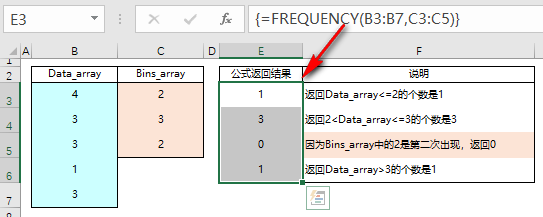 IF(C$3:C$11>=C3,C$3:C$11), 如果 C$3:C$11 区域的值大于等于 C3,则返回对应的数值,否则返回逻辑值 False;利用 FREQUENCY 忽略逻辑值的特性,将大于等于 C3 单元格的值作为分段点;因为重复出现的分段点返回的是 0,所以返回的结果的非零数就是大于等于 C3 的不重复个数;最后用 SUM 函数求非零的个数,就是 C3 在 C$3:C$11 的排名。❶ 当我们需要对数值分段统计个数时,可以使用 FREQUENCY 函数;❷FREQUENCY 返回的结果为数组,需要用数组公式的形式输入。❸ 「分组的界点值」中的每一分段点,是以左开右闭的规则来分组。=FREQUENCY(C3:C18,{59,79,89})