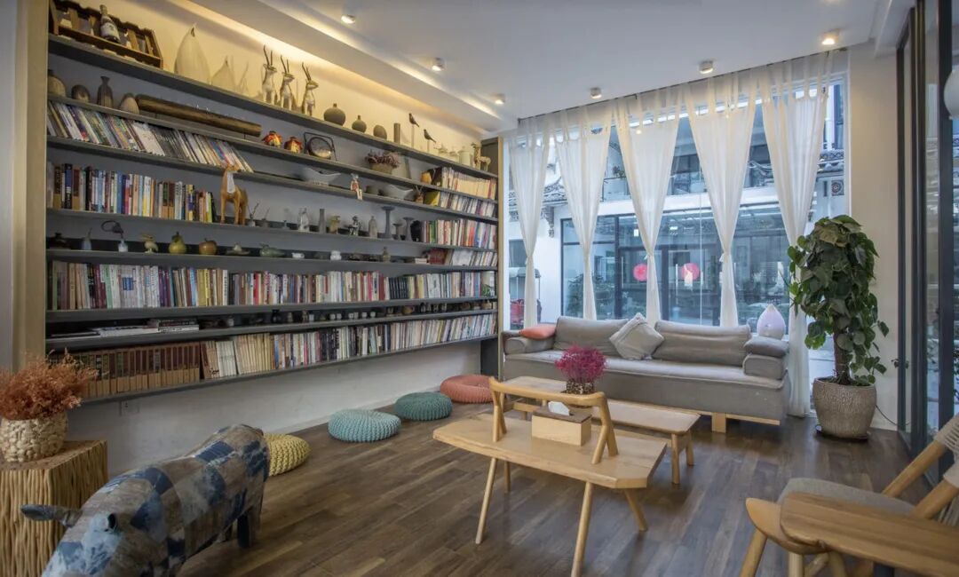 穿过布满绿植的木栈道,进入706大理青年空间室内,一个开阔的大厅,角落还有一个隔开安静的图书区域,里边还有个开放式厨房