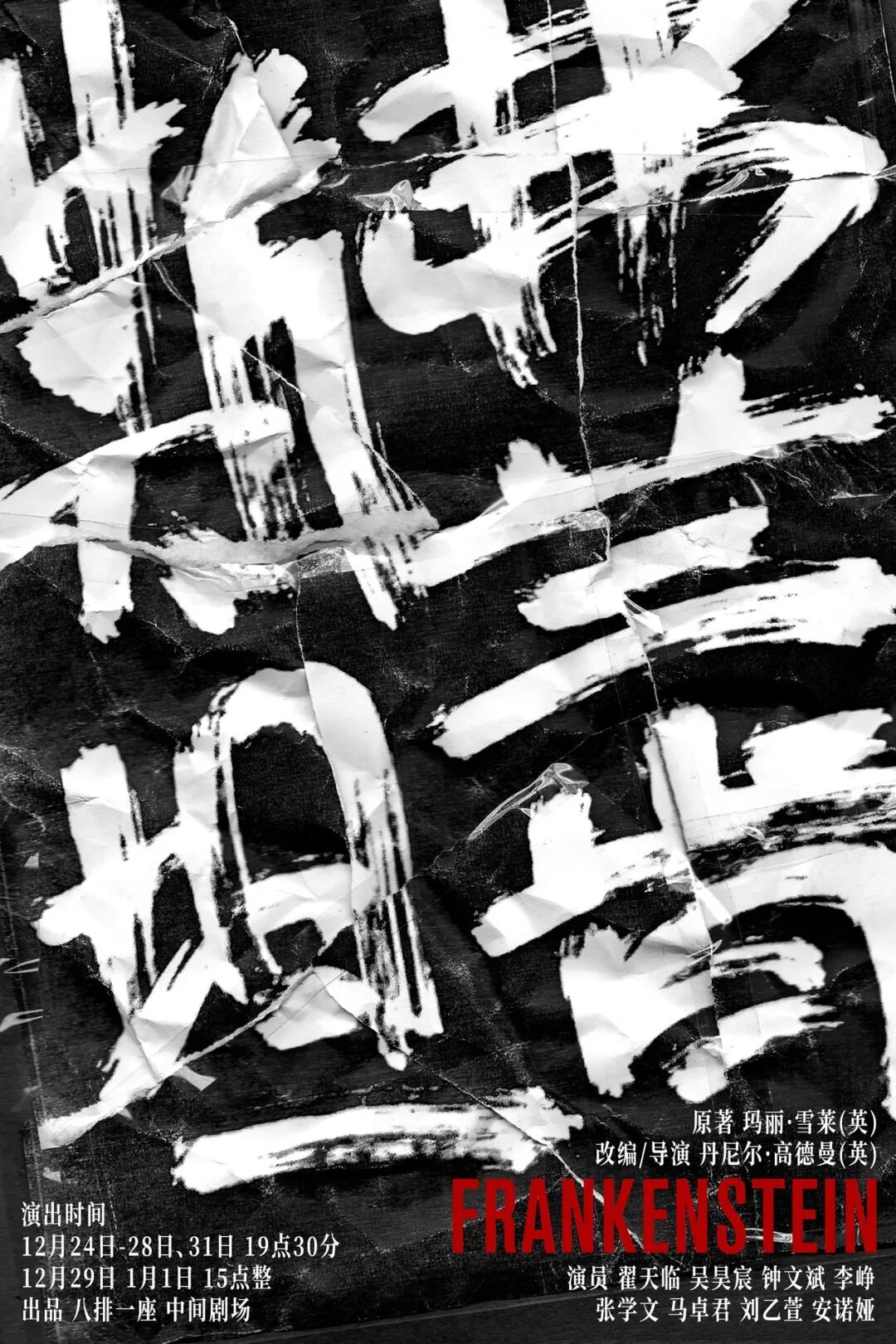 在2018年第一届科技艺术节上,由中间剧场制作出品的话剧《好几个》(A Number)就曾将克隆技术之下自我构建认同的问题带到大家面前;今年的科技艺术节开幕戏上,我们呈现了《狗还在叫》这部作品,用摄像头这一深刻介入现代生活的媒介来探讨沟通和科技手段下人们始终存在的对于身份、自我、情感的焦虑和困惑。这些作品背后所指向的更深刻的问题在于:科技是否是造成这一系列危机的根本?这是中间剧场一直以来未尽的探索话题,也是此版《弗兰肯斯坦》被搬上舞台的契机。作品内在强大的生命力和其蕴含的人文思考也在不断拷问我们:现代的普罗米修斯们面对日新月异的科学力量,成为“造物主”已不是不可能,而我们是否能够承担为此偷盗火种后,可能接踵而来的种种因果?12月24日 19:30 12月25日 19:3012月26日 19:30 12月27日 19:3012月28日 19:30 12月29日 15:0012月31日 19:30 01月01日 15:00