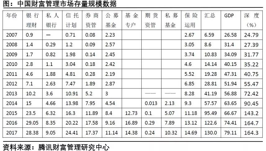 观念变化的背后,是工具的丰富:根据2018年1月腾讯财富管理研究中心和国家金融与发展实验室联合发布的报告显示,中国的财富管理市场,在2017年已经高达130万亿,分布在银行理财、私人银行、信托计划、公募基金、保险等各个领域。