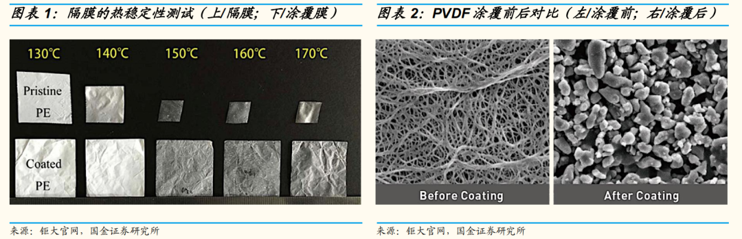 1.1 涂覆材料小而弥坚,护航电池大有可为涂覆工序可改善聚乙烯基膜性能。在聚烯烃隔膜上涂覆陶瓷等纳米材料或采用有机材料,使涂覆隔膜具备热稳定性高、热收缩低、与电解液浸润性高的优点,涂覆工艺日益受到重视。涂覆改性通过粘接剂将功能涂层粘附在隔膜表面,以提高其热稳定性。图表 1 为勃姆石涂覆在聚乙烯基膜上的热稳定性测试,当温度加热到 170 度,隔膜已发生明显形变,涂覆膜几乎无收缩,涂覆工序可改善隔膜熔点低、安全性差的不足之处。图表 2 为聚乙烯基膜涂覆 PVDF 前后对比,聚乙烯基膜呈现湿法隔膜典型的树枝状微孔结构,表面涂覆 PVDF 有机粒子后,聚乙烯基膜上附着了一层 PVDF 涂覆层,形成大量微孔,提高电解液保持率,有利于锂电池内阻的降低和放电功率的提高。