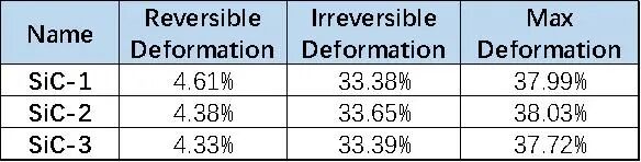 同样的对于氧化亚硅基材料,从压缩性能方面进行了对比测试评估。如图7及表2为四种材料的应力应变曲线及形变情况对比,从形变比例上看,对于烧结温度不同的四种材料,压缩性能上SiO-2及SiO-3两种材料整体压缩性能差异不大,而相对烧结温度最低的SiO-1及烧结温度最高的SiO-4两种材料,最大形变量有明显差异,初步判断可能是随着烧结温度的升高,材料整体致密性更好,材料抗压缩能力变大。表征材料塑性形变参数即不可逆形变的数据上看,烧结温度较高的SiO-4材料的塑性形变最小,而对于材料应力作用下的弹性形变及可逆形变,从数据上看整体差异不大。但实际粉体颗粒压缩过程中是多重力共同作用的,应力也是一个综合变化的过程,可结合其它测试手段做进一步分析。