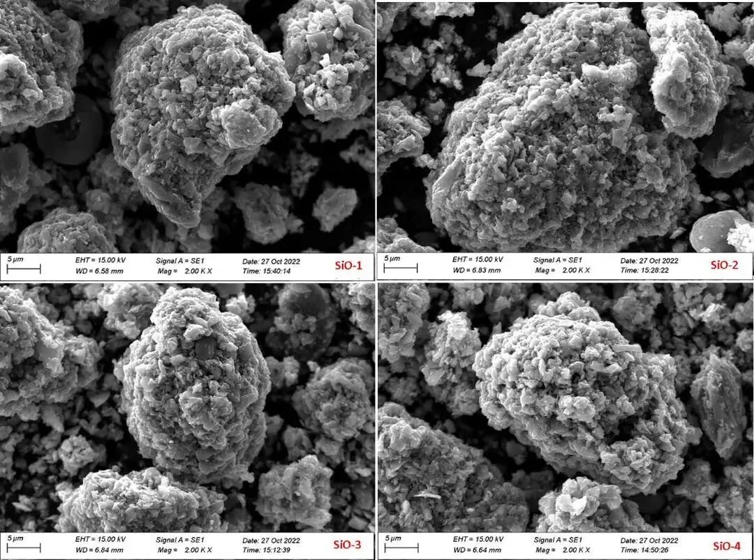 相比于单质硅,氧化亚硅基复合材料在首次嵌锂过程中发生反应,原位生成Li₂O,Li₄SiO₄和Si,其中Li₂O和Li₄SiO₄为电化学惰性成分,不参与后续的电化学反应,与生成的单质Si互相均匀分散,在很大程度上缓冲了单质Si在充放电过程中的体积膨胀,提升整体电极材料的循环稳定性。然而氧化亚硅基材料在脱嵌锂过程中依然存在膨胀效应,导致容量衰减问题, 且导电性差,其应用主要经过碳包覆、纳米化、多孔结构设计、与高导电相复合等手段对其进行改性应用。本部分选取表面包覆0.1%的碳,不同烧结温度下的四种氧化亚硅基材料SiO-1、SiO-2、SiO-3、SiO-4(材料烧结温度:SiO-1<SiO-2<SiO-3<SiO-4),分别从SEM形貌、导电性、压实密度、压缩性能几个角度进行测定分析。如图6为四种材料的形貌测试差异对比,从形貌结果上看,四种材料并没有明显差异。相比于单质硅材料,该氧化亚硅基材料呈现无规则的表面疏松形貌。