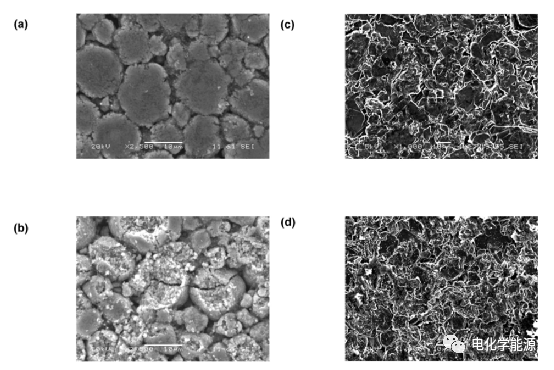 与新鲜阴极相比,在80°C下老化的阴极在微观结构上有很大的不同。不仅显微组织的中心开裂,而且还有一些其他区域被粉碎。随着这些裂纹的形成,电导率降低,阴极的电阻分量增加。比较日历老化前后阳极活性材料的SEM图像。没有观察到它们的形态有任何明显的变化。在两个样品的表面都可以识别出几乎相同的石墨的典型片状结构。由此可见,阴极活性物质在高温储存时的劣化程度要比阳极活性物质严重得多。