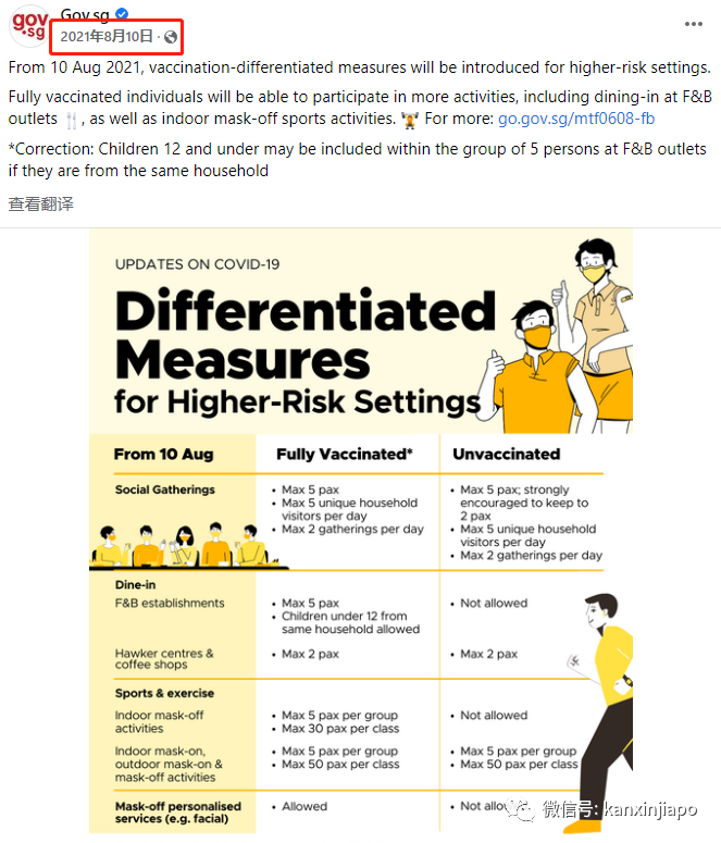 最近,一张疫苗接种差异化措施图表在新加坡朋友圈内流传,许多人误以为政府即将在8月实施新的管制。据新加坡眼了解,其实这是新加坡政府在去年发布的一张制图,上传时间为2021年8月10日。