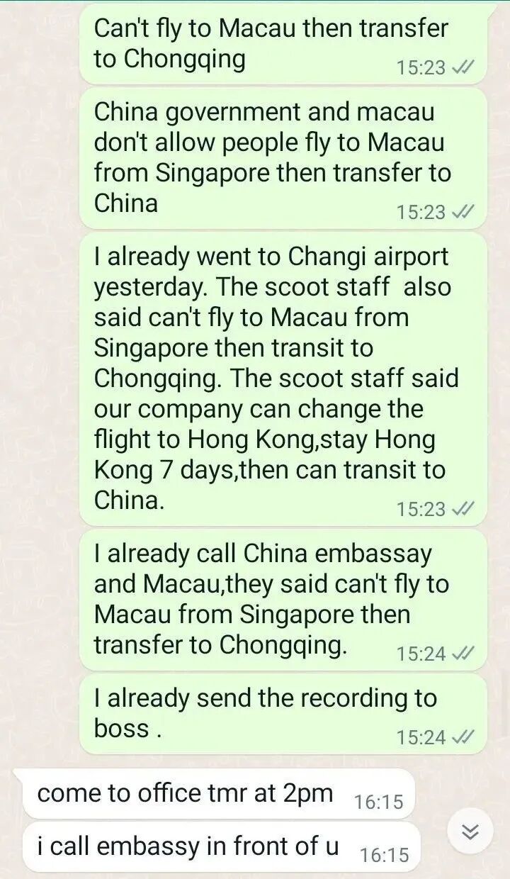 为了求证这件事情,我还去了樟宜机场,咨询了T1离境大厅的酷航工作人员,酷航工作人员也说:不可以新加坡飞澳门再澳门转机飞中国!只有新加坡飞香港可以,但是要在香港隔离,隔离完了可以飞回中国!