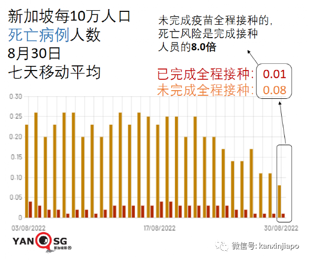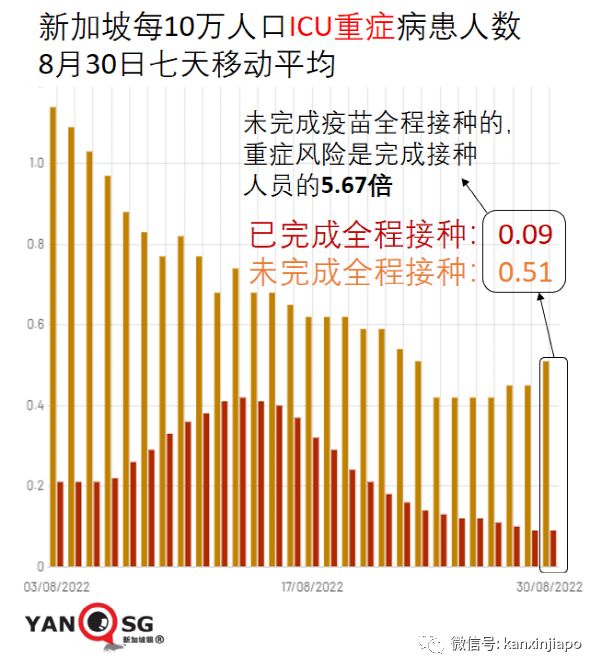 《新加坡眼》多日前已判断,确诊病例增长率接下来会逐步向1.0回升。长期来说,将在1.0上下微幅波动。随着每次出现新变异株和出国旅游潮,例如六月、十二月学校假期,会迎来一波波新感染潮。ICU重症病房昨天有冠病病患10人,比前一天增2人;ICU病房占用率为2.9%。ICU重症病房已连续16天有0岁至11岁儿童重症病患。未完成疫苗全程接种的人员,重症风险是完成接种人员的5.67倍。卫生部昨晚通报1起新增死亡病例,累计1592起;新增死亡病例为七旬或以上年长者,病逝于8月30日。未完成疫苗全程接种人员的死亡风险是完成全程接种人员的8.0倍。按病毒株的种类划分,新加坡经历了原始病毒波,去年进入德尔塔波,现在是奥密克戎波。本波疫情病死率维持在0.048%,与前一天同,为流感病死率的一半。新加坡原始病毒波感染的绝大多数是宿舍客工,年富力强,病逝2人;德尔塔波和奥密克戎波则主要感染社区,病逝者大多是年长者,年迈体弱。普通输氧病患有26人,比前一天少4人。普通输氧病人使用的是普通隔离病房和面罩式呼吸机,无创,无须建立人工气道,不插管。过去28天,新加坡累计出现10万2411起确诊病例,其中99.7%为无症状/轻症,0.3%曾需要/正需要普通输氧,0.06%曾是/仍是ICU重症,0.04%死亡。在国家疫苗接种计划下,已完成疫苗全程接种人口比例为93%,已接种加强针人口比例为79%。五旬以上人口已开放免费接种第二剂mRNA加强针。新加坡境外输入病例昨增209起,累计6万4274起。点击下面视频,可以看到更丰富的内容!