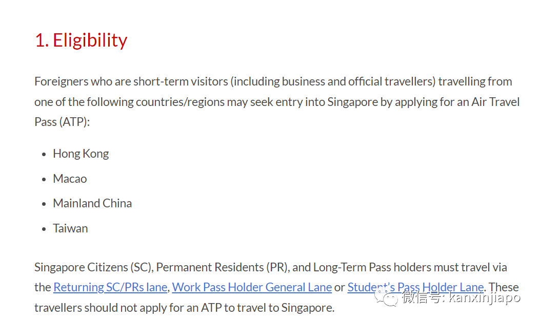 根据新加坡移民局(ICA)的最新条例,除了新加坡公民、永久居民、学生准证持有者、工作准证持有者以外,所有从中国大陆、香港、台湾、澳门地区进入新加坡的旅客,都需要在预计入境的7~60天之间,于新加坡移民局(ICA)官网申报健康信息,申请航空通行证。身份: