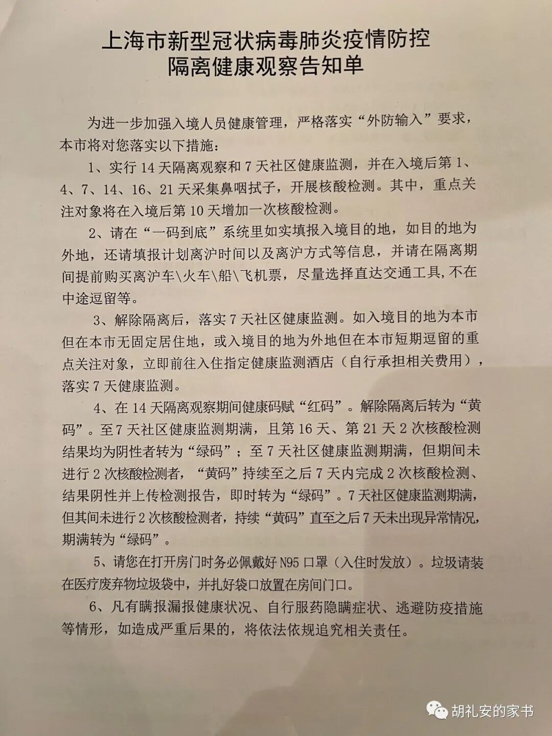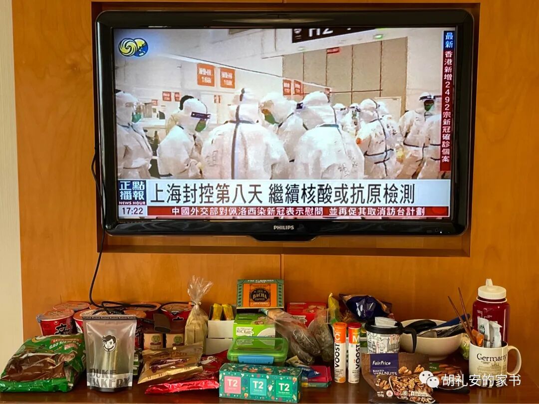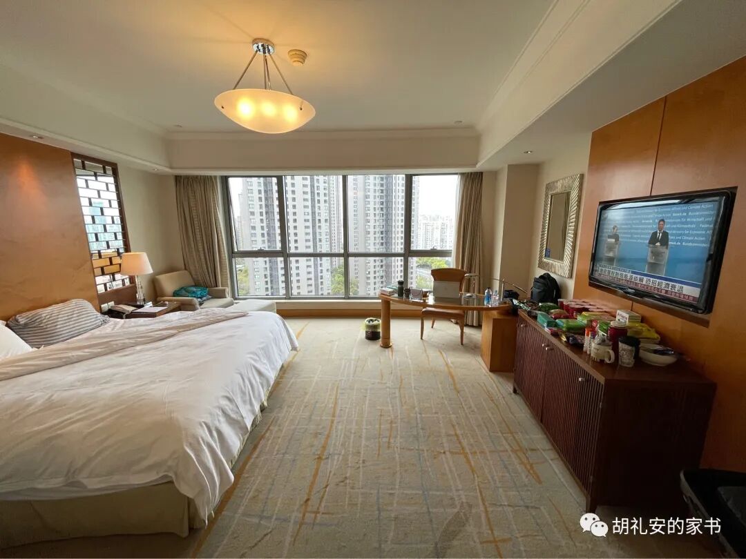 所以第一次要被完完全全禁止出房门一步,度过整整14/21天,光是这个念头就觉得沉重,我觉得我可以接受,但不会享受。第二是,国内坚决清零的防疫措施,与我在新加坡,以及疫情下去过的法国、韩国和了解的其他国家,是完全不同的道路。我只希望下限不要太低。加上出发前,上海已经宣布封城,我预期物资肯定会紧张,快递外卖估计都会停掉。所以我这种平常不吃零食的人,都背了半个行李箱的食物过来 - 方便面,茶包/咖啡/奶粉,各种能够用开水冲兑的粥类,还有各种坚果,我甚至带了7根真空包装的玉米做早餐 just in case。这是4月5日的新闻 - 上海全城封控5天,官方保障生活物资。头两天的经历,大概是10分可以打9分, 已经远远超出我的预期了。说实话,D2还有那种隔离刚开始,很享受自己能够独享空间的新鲜感,吃住条件不错,工作照常。而且是在1)非常难回国;2)上海正在封城 - 这个双重”困难“的节点回来的,深感幸运。回来后条件不错,整个体验都比我预想的要好。所以,真的是惊喜了,这种惊喜转变为放松的心情,积极的状态,对于隔离的担忧基本上没有了。白天忙碌工作,晚上也被各种信息占据了注意力和时间,比如许多朋友知道我回国之后的关心、询问、约饭。所以,一天的时间过得很快,根本不会无聊。目前D2的感觉就是:我会以很好的心态和状态度过这14/21天的隔离期的,我会享受的,我不会抑郁的,我会过得很充实的。1740 晚餐 = 胡萝卜丝炒鱼块,青椒回锅肉,鸡腿,青豆炒黄瓜,苹果汁,小零食(海苔卷)酒店分发的入住需知。但是政策一直在变化,这份需知上的一些白纸黑字的规定,也跟着变更。比如,核酸检测的要求,并非下面写的第1,4,7……天,而是第1,7,13天。黄昏下,通过窗户可以看到一点“魔都四件套”的身影。这是正式在隔离酒店度过的第一天,还有新鲜感。对自己说,我已经很幸运了,会把这里当成接下来14天的家。虽然只能站在窗后,也不妨碍我欣赏着黄昏下的上海,这座我一直以来欣赏喜欢的大都市。和一些在上海的朋友们联系了,他们的确面临生活物资紧张困难的问题,需要通过社区团购自救。
