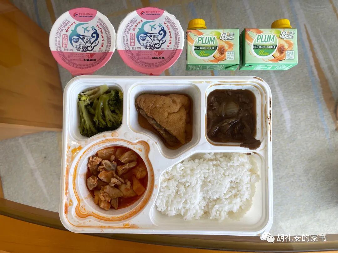 0745 早饭送达,但是这次懒得起来,于是继续睡。我睡觉不会把窗帘全拉上,想要自然醒。窗外阳光明媚,春光好极了。对面的小区,绿的树红的花蓝色的游泳池米白色的外墙,看上去真舒服。阳光出来了,照耀在马路、街道、建筑物上,就是很简单地让人心情好。17度的天气,穿夏装也行,穿春装也行。可能是很久没有体验过春天了,现在感到:原来春天这么舒服啊!起床就把窗户打开。只是两扇窗户,可以从底部打开大概10度左右。但就是这个10度,也是makes a huge difference。因为有空气交换,有新鲜空气进来,而不是一直呼吸recycled air。站在窗边,我端着茶杯,感受到外面的空气和清风,能够听到街道上的少量车辆经过的声音,和楼下花园里的鸟鸣。就是这一点点可以和外面的世界产生连接的空间 (虽然连我的手都无法伸出去) 可以让我感受到外面的清风,呼吸到外面的空气,让我觉得这个空间没有那么密闭难受,起到了四两拨千斤的作用。我来隔离之前看到别人的体验,说窗户会被锁,不能打开之类的。所以这也是我的预期。而这一点又被打破了,于是又被惊喜到了。窗外的上海,春光明媚。街上依然看不到一个人,也只有零零星星的车辆通过。听到大喇叭播报,不知道在说什么,肯定是和防疫相关的通知。楼下的花园,清晰可见池塘里游动的锦鲤,听到清脆的鸟鸣,一派春意盎然的模样。我就站在窗户边,感受到那连手都伸不出去的opening吹进来的春风,放着音乐,看着外面的阳光绿树红花池塘,感到心情宁静、怡和、舒畅、治愈。虽然不能出去,但目前还不觉得拘束or羡慕or向往出去。就这样在室内待着也挺好的。这是D3,还有新鲜感。1230 中餐 = 白萝卜肘花火腿肠,辣椒鸡翅三个, 青椒春笋炒牛肉, 包菜丝青豆,红豆薏米粥,蓝莓汁。今天气温在20度以上吧。外面艳阳高照,我坐在凳子上都发热出汗,当然了还不是夏天那种热。封城的上海,路上基本还是没人少车,挺安静。1740 晚饭 = 虾仁, 回锅肉, 萝卜丁腐竹炒牛肉,包菜丝青豆,石榴汁,香蕉脆片。大家都纷纷表示:隔离餐食挺好吃,我也这么觉得!0800 早餐 = 煮鸡蛋,红豆糯米莲子糕点,咸鸭蛋一粒,白米粥,小面包,酸奶一盒。