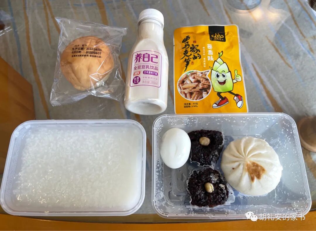 1)原本我们已经订好的14天隔离结束之后的+7的酒店,因为政策变化,也许不能接收我们了。下周酒店会给我们确定。与此同时,我们要去找其他的酒店作为替代方案;2)进入北京的要求更新了。进京之前要求必须在一个新冠零病例的城市/地区待至少14天。来之前的政策是,在上海完成21天隔离,然后启程去北京,在住处进行14天隔离。现在,这条路不通了。Oh well…没什么的,我心态一直很佛系。既然政策变了,我们又无法改变政策,那就只能跟着最新的政策来计划下一步的行动了。上海已经封城了这么长时间,连去到外地的上海人都受到网暴。魔都眼下正在发生的各种危机,真的远远超过“魔幻”的程度。晚饭送来了。窗外有大喇叭广播,听不清楚到底在说什么,大概是喊居民做核酸的。这个广播来自酒店周围的小区。到了晚上8点半,天都已经黑下来,还能够听到有人用喇叭大声喊“请下来做核酸”的广播。我正准备小睡一会儿,突然有人敲门。测核酸,又是一轮“全市大排查”,还是同样的工作人员。1740 晚餐 = 狮子头,鸡腿,笋丝胡萝卜丝肉丝,青菜我们都表示今天的晚餐好吃,尤其是这个狮子头。听说酒店的伙食是每个星期重复一个cycle,也许下周就要吃同样的菜了。不过,我们都认为,在目前上海封城的情况下,吃得已经不错了,很幸运了。0800 每天自然醒感觉不错,没有那种疲劳的“被迫起床”的感觉。早饭 = 白米粥,一包雪菜,一个鸡蛋,一个大肉包,两个小菜包(里面是榨菜之类的咸菜),一盒蒙牛牛奶,一块蛋糕。我在新加坡是极少点外卖的。这一周感觉每天都制造很多塑料垃圾。每天三餐就是至少三个大餐盒,里面是食物垃圾,然后还有餐具垃圾,以及塑料袋垃圾,这些垃圾又会包在更大的医疗垃圾专用塑料袋里面……我相信在疫情之下应该是不会进行垃圾分类的。我目前就继续保持staycation的心情,度过接下来的7天。感觉时间好快,仿佛昨天我刚抵达,还在跟朋友说我要开始隔离的事情,结果今天就已经是D7了。