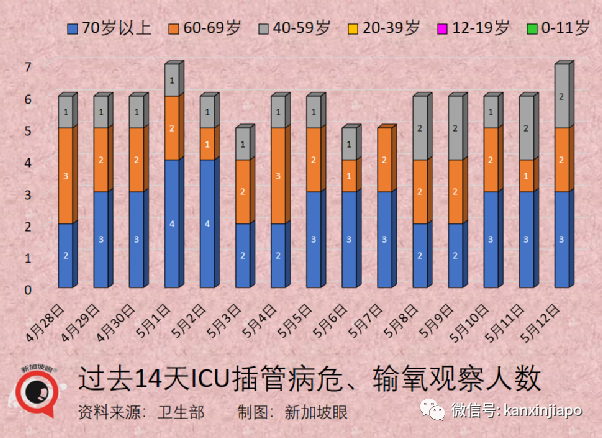 按年龄分,七旬或以上3人(=),六旬2人(+1),40岁至59岁2人(=);括号内数字为今昨日比较。