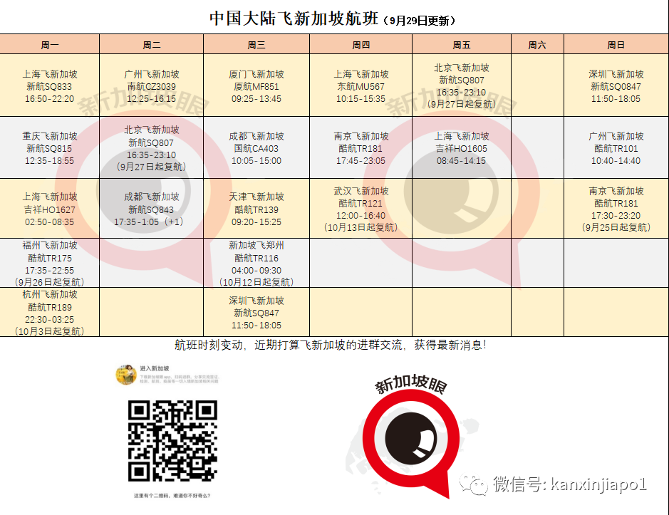 9月27日,吉祥航空在“新加坡眼”APP独家发布最新赴华消息。从10月14日起,原定新加坡飞南京HO1606航班恢复为新加坡飞上海!每周一 HO1628 新加坡飞郑州(10:00-15:35)每周五 HO1606 新加坡飞上海(15:35-20:20)9月26日起,新加坡航空正式宣布加密深圳往返新加坡航线的航班!新加坡航空称,自2022年10月26日起,新加坡往返深圳航线由原来的每周一班(周日)增加到每周两班(周三 、周日)。