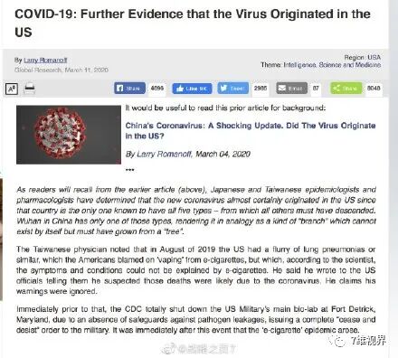 加拿大的一家智库“全球化调查中心”发布文章也称:更多证据表明新冠病毒源自于美国。