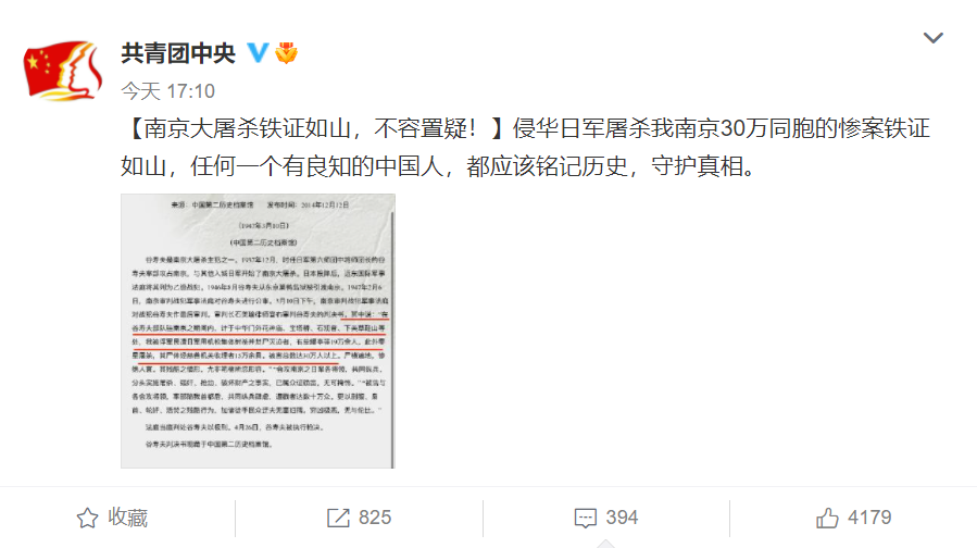 一、共青团中央官方微博第一时间发帖怒斥:【南京大屠杀铁证如山,不容置疑!】侵华日军屠杀我南京30万同胞的惨案铁证如山,任何一个有良知的中国人,都应该铭记历史,守护真相。