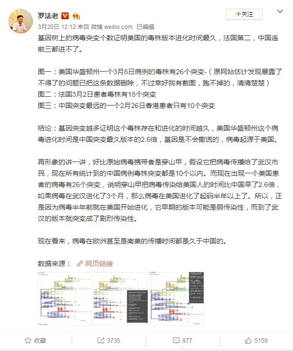其实关于“如果病毒起源于美国,为什么看上去美国爆发的比中国要晚”这个问题及病毒的来源、变异,在3月20日就有人通过美国的数据得出一个结论: