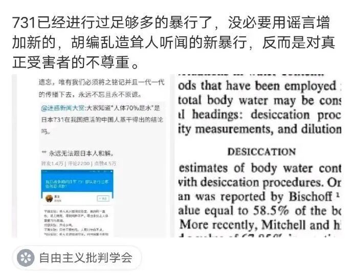 @Ent_evo 后来还专门发了长帖,称“把尸体蒸干测量含水量不现实”,指“人体的含水量就是因为731才知道的,19世纪你就知道了。”