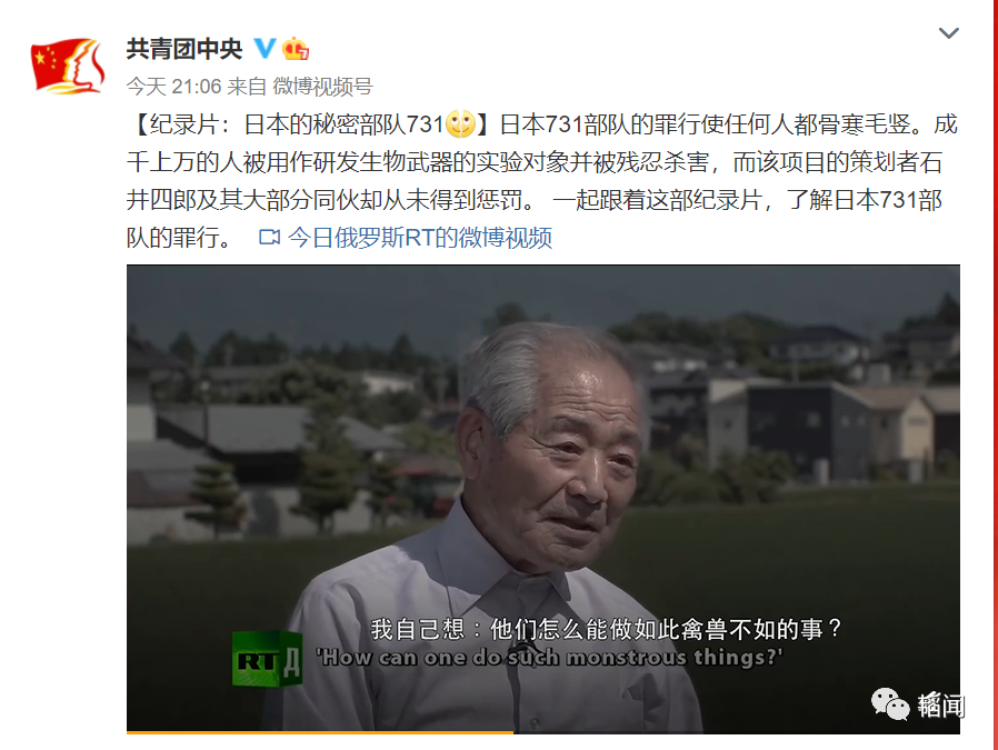 昨天晚上 21:06 @共青团中央 转发了这个视频,并评论说:日本731部队的罪行使任何人都骨寒毛竖。成千上万的人被用作研发生物武器的实验对象并被残忍杀害,而该项目的策划者石井四郎及其大部分同伙却从未得到惩罚。一起跟着这部纪录片,了解日本731部队的罪行。