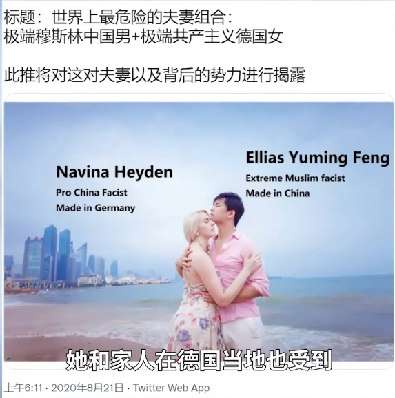 德媒甚至于还发布造谣、污蔑式的报道,称海雯娜与中国男友是“世界上最危险的夫妻组合”,称海雯娜是“极端共产主义德国女”,而她的中国男友是“极端穆斯林中国男”,扬言要对“这对夫妻以及背后的势力进行揭露”。
