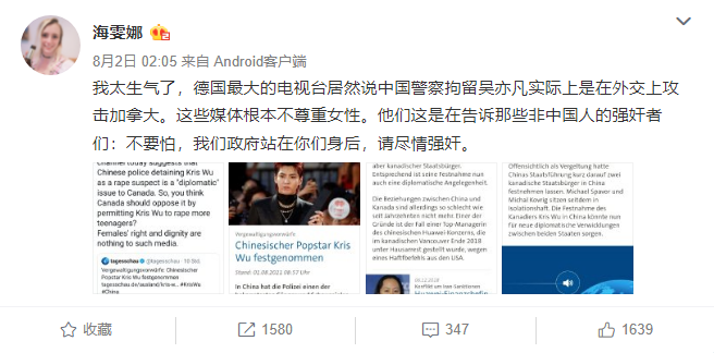 8月2日,海雯娜在微博上还曾怒斥德国最大的电视台,指其居然说中国警察拘留吴亦凡实际上是在外交上攻击加拿大。