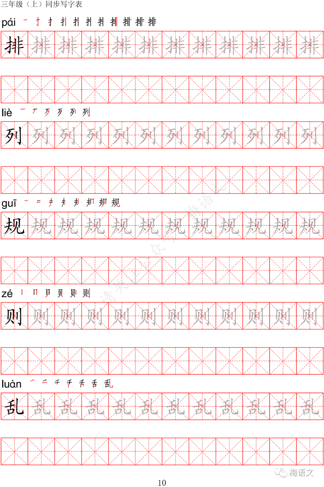 这份写字表练字帖是根据统(部)编版三年级语文上册教材整理,孩子在下学期就要接触学习,在这里梅老师提前分享给大家,可以让孩子在暑假提前学习练字,为下学期的学习打下基础。
