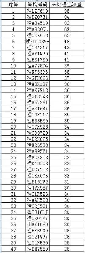 ■ 5月27日,广西交警总队向社会曝光今年以来小车交通违法量排名前20的突出违法车辆名单。其中,未处理违法量最高的一辆小车多达98条。【详讯】