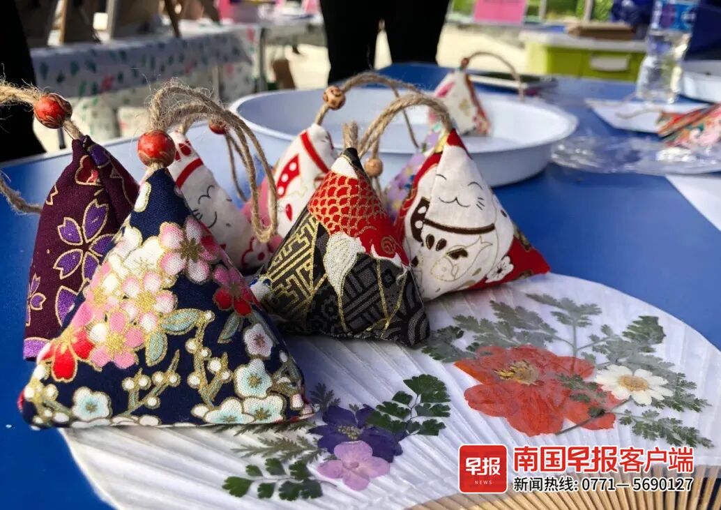 在南宁园博园,有游客专门前来体验制作邕宁蒲庙传统手工香囊“马骝佝”,以及体验扎染手工艺品制作。