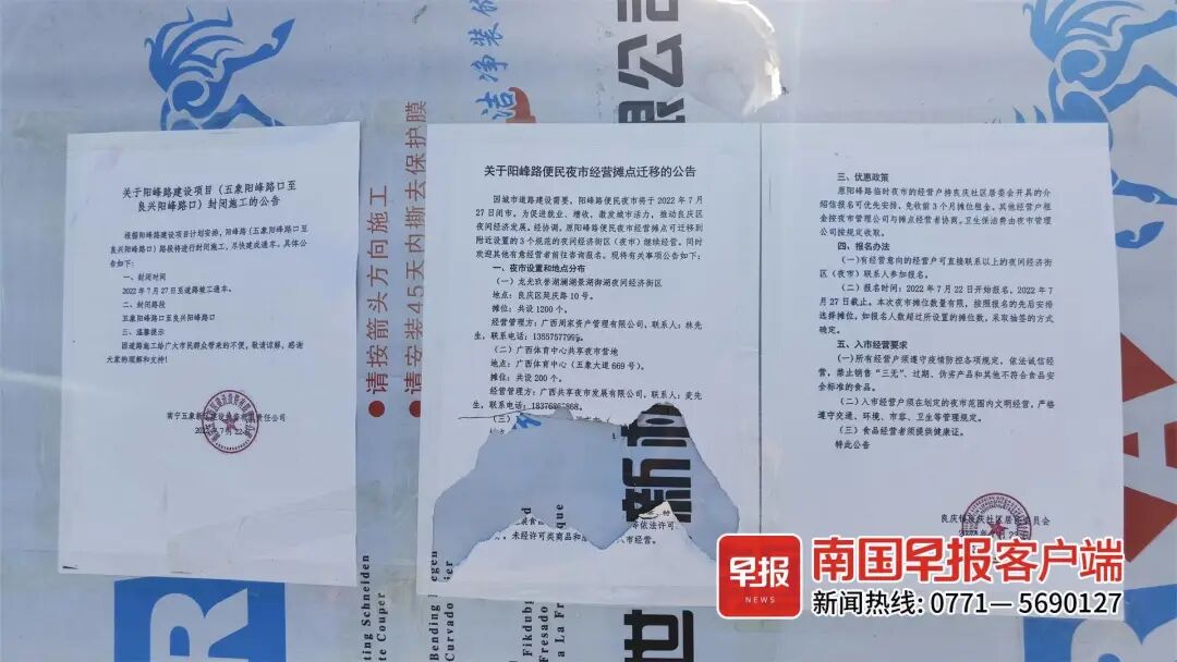 另一则由良庆镇良庆社区居委会张贴的公告称,因城市道路建设需要,阳峰路便民夜市将于7月27日闭市,原夜市经营摊点可迁移到附近设置的3个规范的夜间经济街区(夜市)继续经营。