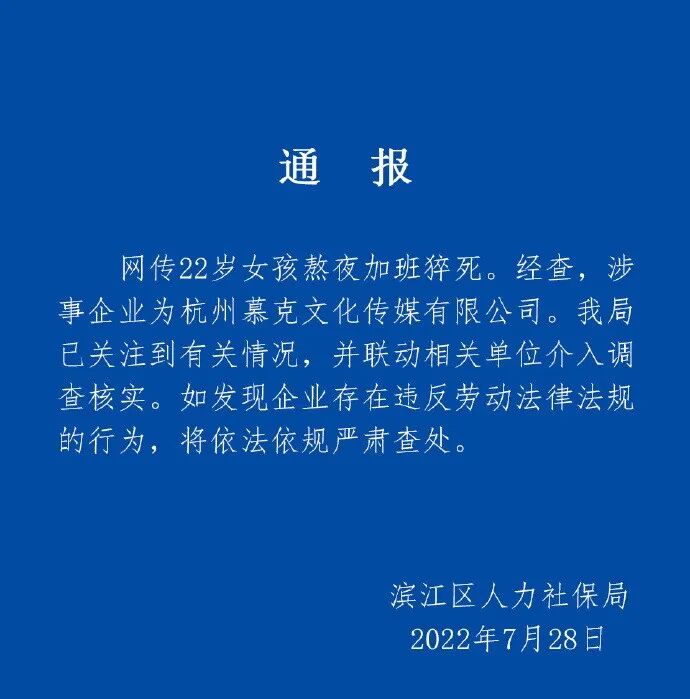 日前在杭州,22岁的女孩小宋连续四五天熬夜加班后,突发疾病进ICU抢救。7月26日,小宋不幸离世。此事引发网友关注。7月28日,杭州市滨江区人力社保局发布通报称,已联动相关单位介入调查核实。【详讯】
