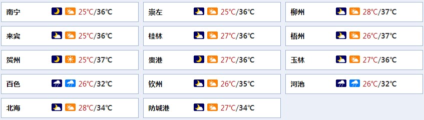南宁市:晴天到多云,偏南风1~2级,最低气温25℃,最高气温36℃。