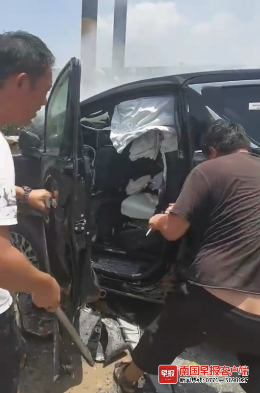 7月28日,泉南高速12支线北海往柳州方向发生一起交通事故,车上3人被困。事发后,路过的群众纷纷出手相救,迅速救出2人,因车辆突然起火,最终还有1人憾未救出。