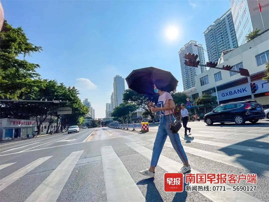▲8月1日上午9时,南宁市天气晴晒。民主路上,市民撑伞出行。