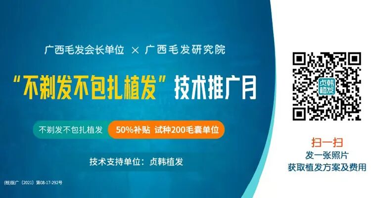 为此,广西毛发研究院、广西毛发会长单位打造“技术推广月”,推广“不剃发不包扎”植发,选择“不剃发不包扎”植发的市民可享受该技术50%补贴,也就是5折植发,还可享受不剃发植发试种200毛囊单位,由贞韩植发提供技术支持。