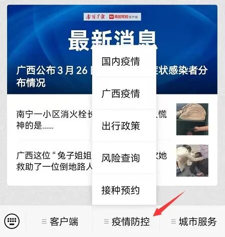 南国早报微信公众号全新升级!关注南国早报微信公众号,在菜单栏“疫情防控”专区,除可查询国内、广西实时疫情动态,还可查询国内中高风险地区、各地出行政策,以及进行疫苗接种预约。