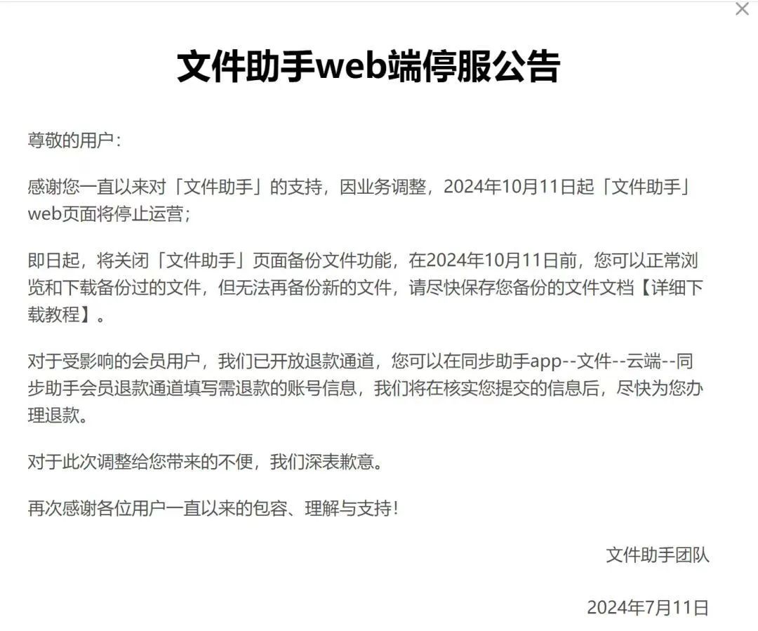 先看内容:根据腾讯文件助手公告,因业务调整