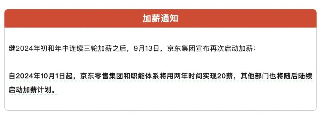 5,2024 年 9 月 13 日,京东再次宣布零售和其他部门,两年时间,再由 16 薪逐步加到 20 薪。