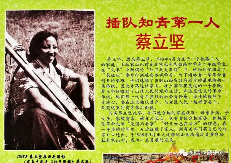 蔡立坚,女,1968年3月,从北京到榆次杜家山插队落户,是大批北京知青到山西插队的带头人。十多年中,她同全村五户社员和陆续上山插队的百余名知青,开山治坡,打坝造田,把原来的百十亩耕地扩展到400余亩,由年产粮食1万斤增加到11万斤。种植苹果树500余株,核桃树2000余株,还有梨树和各种用材树。她和知青们用国家发给的安家费为村里买的三十多只羊,后来也发展成百余只的羊群。蔡立坚曾多次谢绝招工、升学、提干,1971年入党,曾任杜家山大队党支书、黄彩公社副主任、榆次县委常委、共青团晋中地委副书记、团省委常委、省革委委员等职,是全国第四届人大代表。1969年应邀到首都参加国庆观礼,受到周总理接见。1975年经周总理点名她参加中巴妇女友好代表团出访巴基斯坦。上山下乡结束后在山西省委党校搞教学管理工作,1997年5月因公殉职。