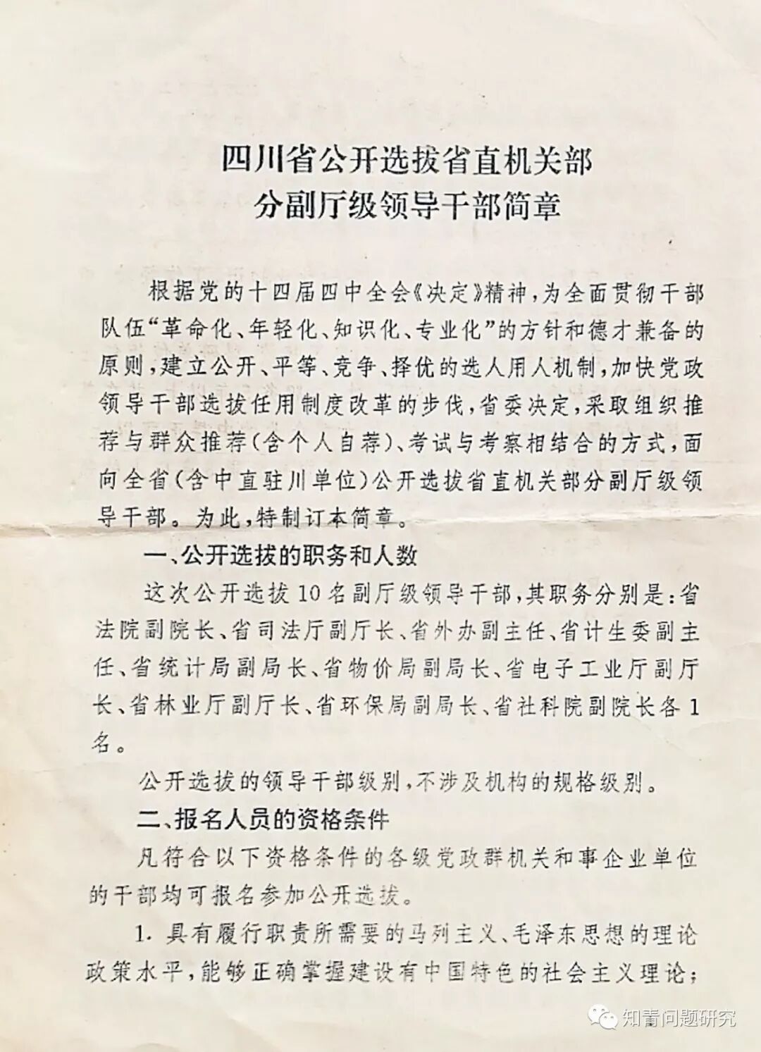 1995年9月,四川省委启动了公开选拔10名副厅级领导干部的工作(以下简称“公选”),历时3个多月。这是自改革开放以来,四川首次面向社会公开选拔副厅级领导干部,其“公选”规模、层次、影响在全国有较大影响。我作为报考者,有幸参与这次“公选”从报名、笔试、面试、考察等环节的全过程,最后被录取担任了省社科院副院长。
