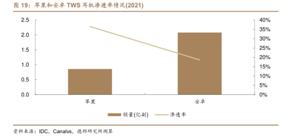 可经过近几年的爆发式增长,渗透率已显著提高,消费者也不好糊弄了。根据IDC的数据,2021年iOS生态内的TWS耳机渗透率已经达到36.5%,安卓阵营也达到18.6%,前者较两年前有接近十倍的增长。